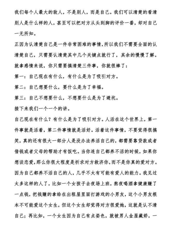 正因为认清楚自己是一件非常困难的事情,所以我们不需要全面的认清楚自己,只需要认清楚其中几个关键点就行了,其余的慢慢了解。就拿感情来说,你只需要搞清楚三件事,你就很棒了:
